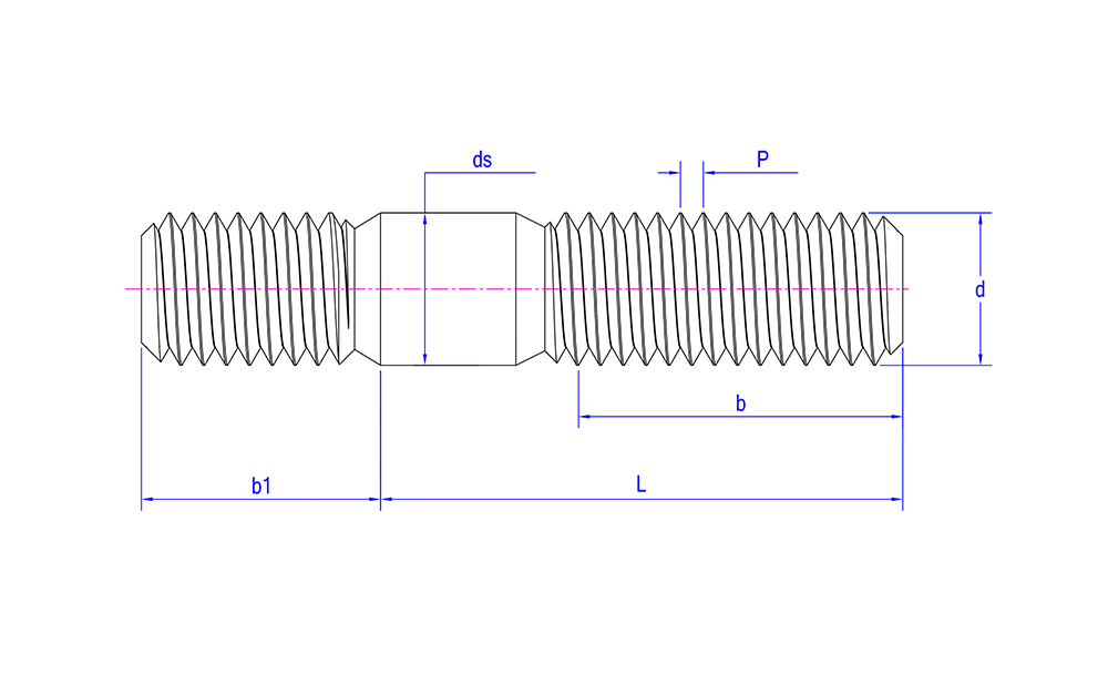 | Udseende egenskaber | Cylindriske dele med gevind i begge ender, normalt lavet af metal, med en sektion uden gevind i midten |